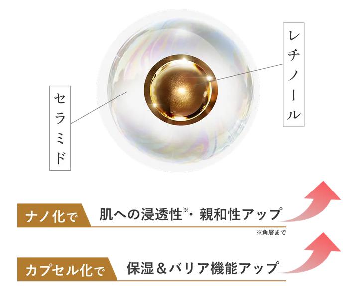レチノールは空気中で分解されるはたらきがあるため、セラミドで作られたカプセルにレチノールを格納することで、分解を防いでいます。