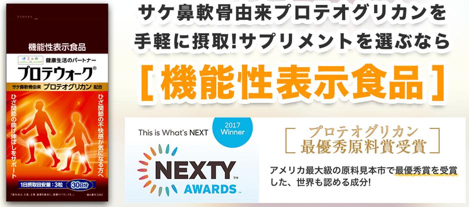 プロテウォークは、機能性関与成分として「サケ鼻軟骨由来プロテオグリカン」を配合した機能性表示食品です。